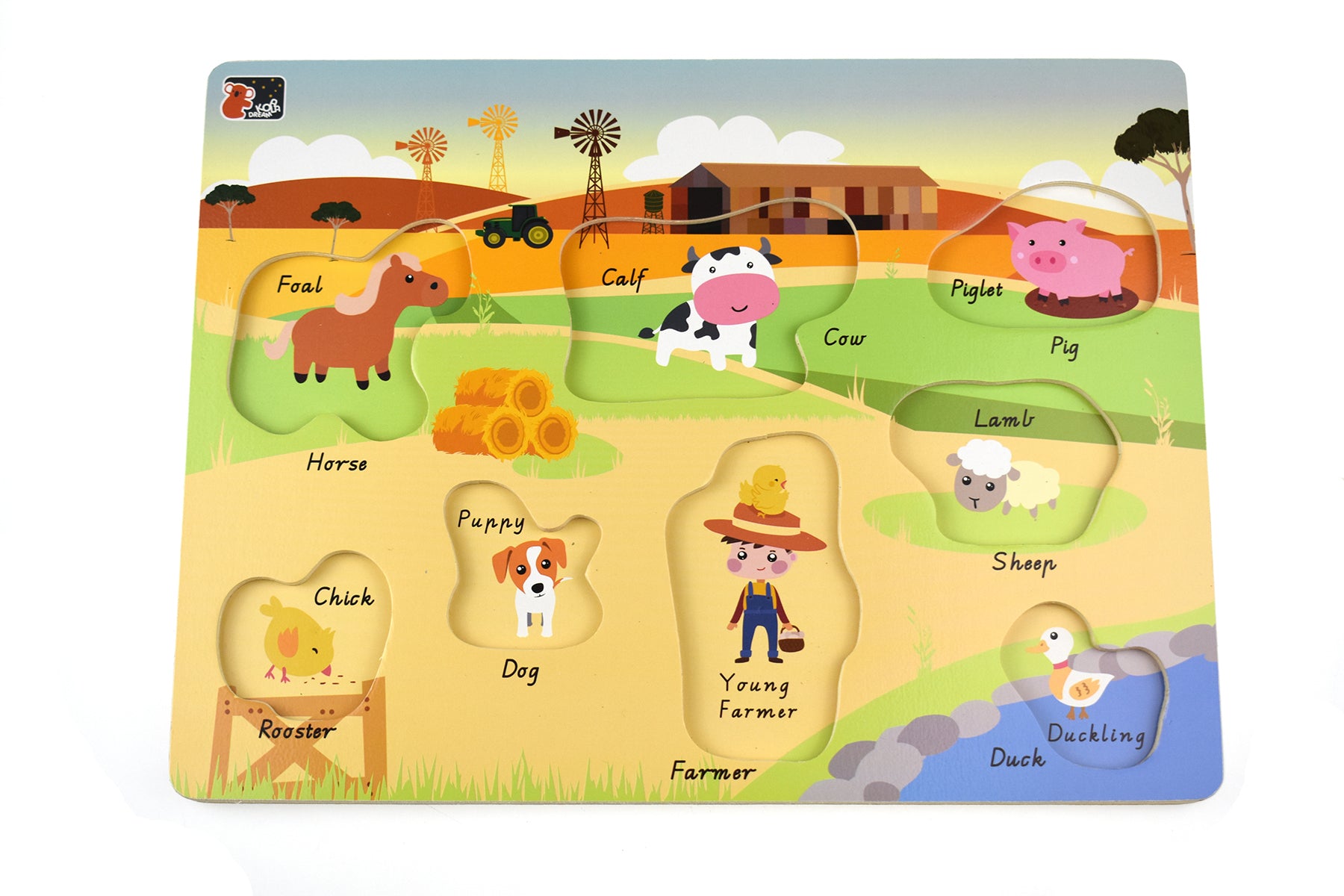 - Includes 8 peg puzzles to lift and discover, such as horse, cow, pig, sheep, duck, dog, rooster, and farmer