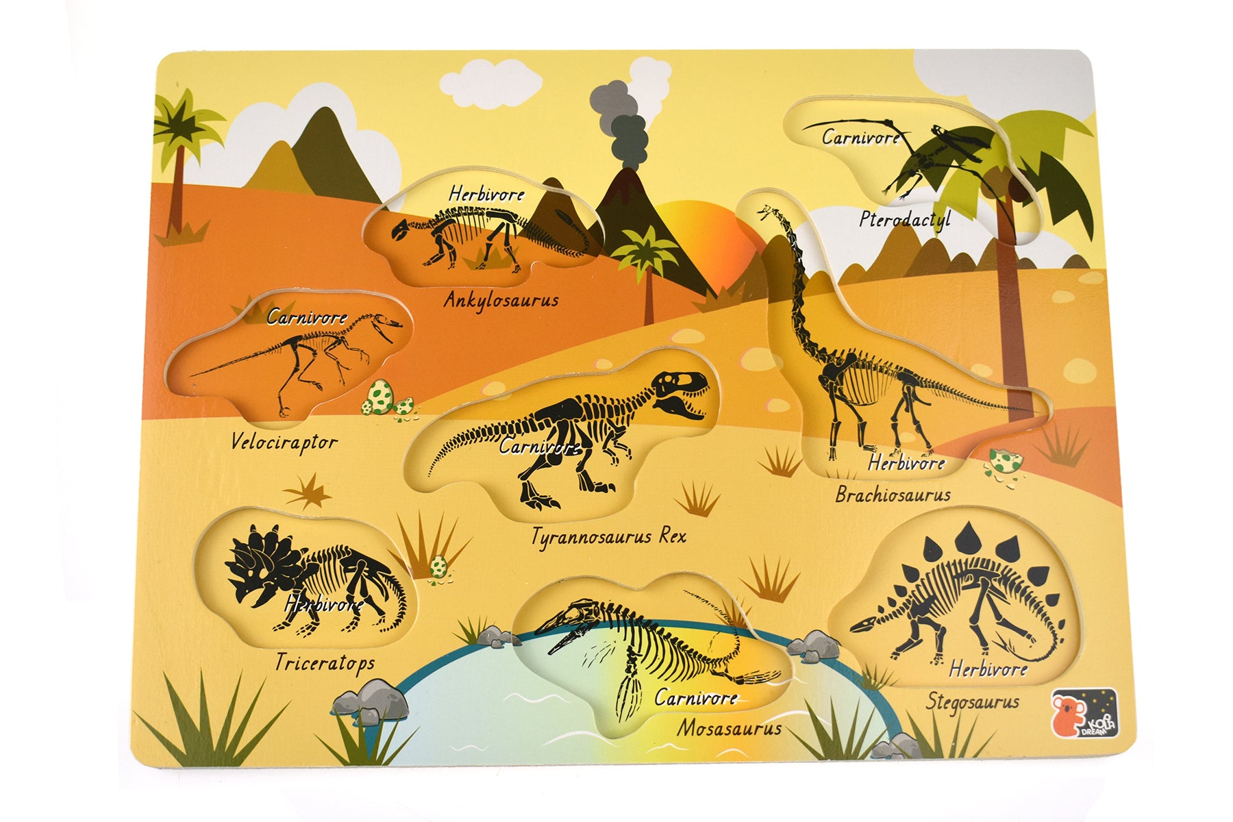 Encourage logical thinking and patience as your child masters the 2 IN 1 DINOSAUR PEG PUZZLE. The 2 in 1 Dinosaur Peg Puzzle by Koala Dream is a captivating wooden puzzle that brings the world of dinosaurs to life. This unique puzzle offers additional features that enhance the learning experience. Underneath each dinosaur, children will discover skeletons, providing insights into the anatomy of these ancient creatures. They can learn about the different body structures and bone arrangements, fostering a deeper understanding of dinosaur anatomy and evolution. Furthermore, this puzzle introduces children to dinosaur diets. Each puzzle piece represents a specific dinosaur and indicates whether it was a carnivore, herbivore, or omnivore. This feature encourages children to explore the dietary habits of dinosaurs, expanding their knowledge of prehistoric life. Designed with young learners in mind, each puzzle piece features a wooden peg, making it easier for little hands to grip and manipulate. The solid 10mm thick wooden board ensures durability and provides a stable surface for assembling the puzzle. With its high-quality construction and educational value, this wooden puzzle is a perfect addition to any child's toy collection. It provides hours of entertainment and learning, fostering a love for dinosaurs and igniting a sense of wonder about our prehistoric past.
