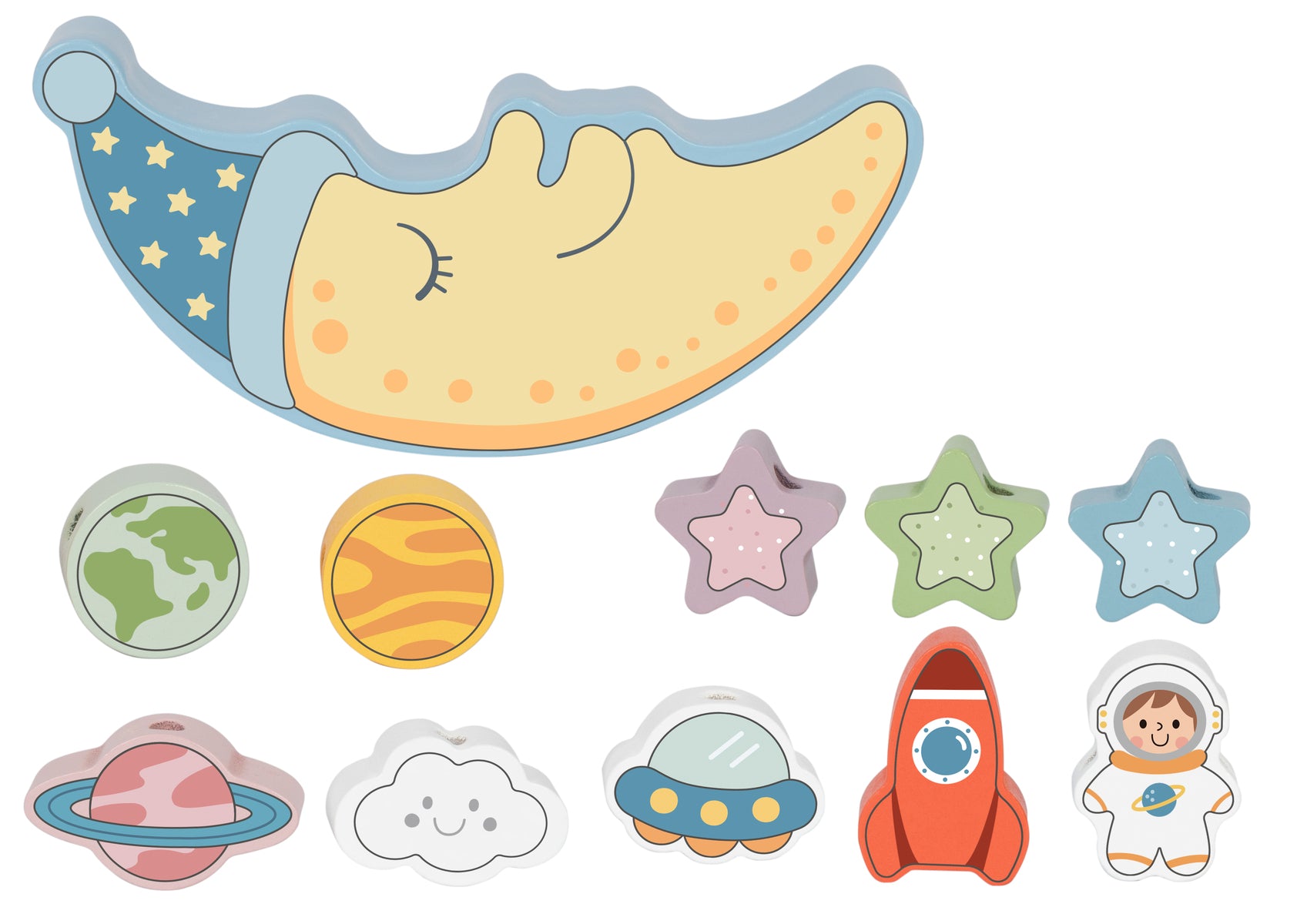 • 10 colourful blocks for balancing on a sleepy moon