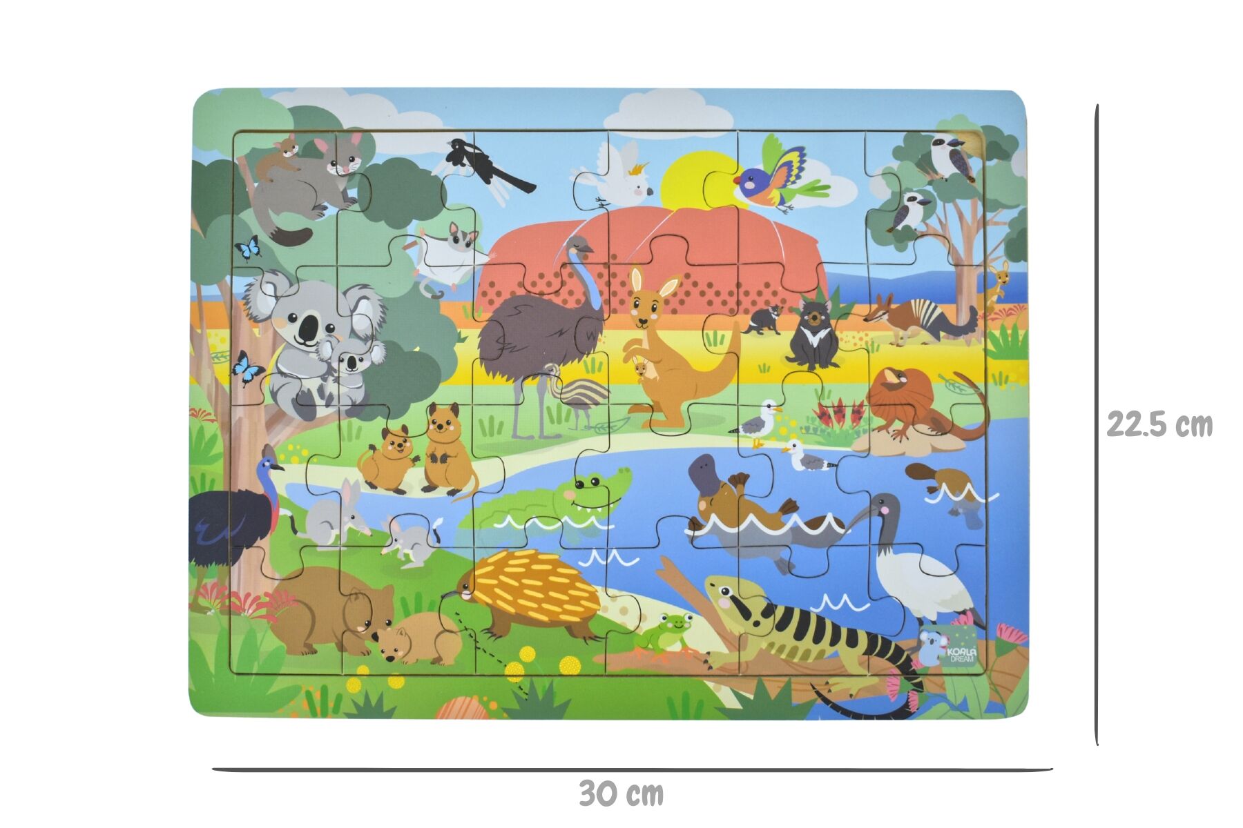 Spark your child's problem-solving skills with the engaging 24PC JIGSAW PUZZLE AUSSIE ANIMALS AND THEIR NAMES. Celebrate Australia’s unique wildlife with the Koala Dream 24-piece Jigsaw Puzzle: Aussie Animals and Their Names. This beautifully illustrated wooden puzzle showcases an iconic Australian landscape, complete with a winding river, lush bushland, and Uluru in the background. Each puzzle piece features a native animal, from the crocodile and platypus to the koala, rainbow lorikeet, and ibis.