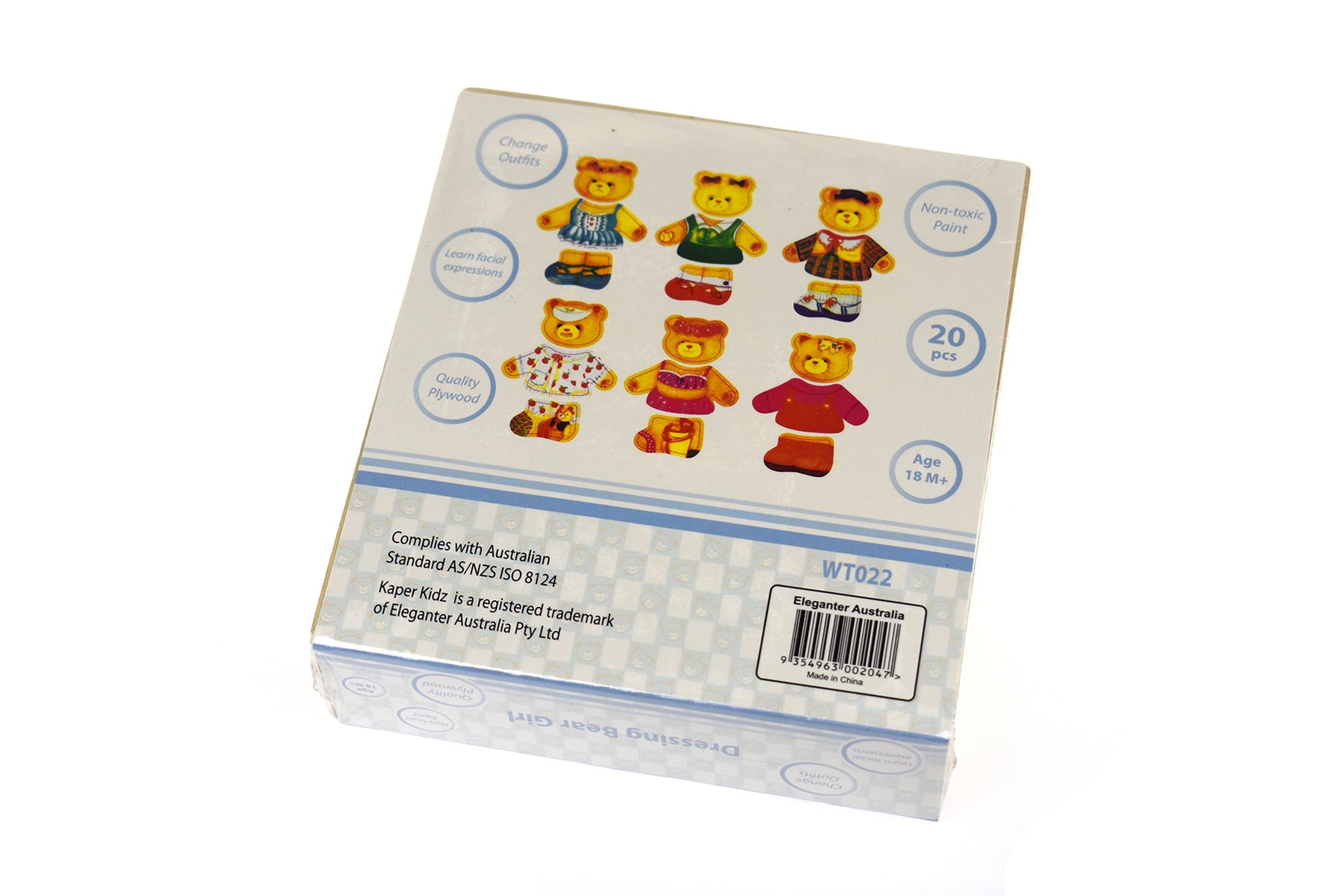 Spark your child's problem-solving skills with the engaging DRESSING BEAR GIRL. Introducing the Dressing Up Bear from Kaper Kidz, a timeless wooden puzzle that sparks creativity and emotional exploration in preschoolers. With 18 interchangeable puzzle pieces, your child can create an impressive 216 unique combinations, dressing the boy bear for different seasons and occasions. This fosters creativity and fine motor skills as they engage in mix-and-match play. But the Dressing Up Bear doesn't stop at fashion choices. It features six distinct facial expressions, allowing children to learn and discuss a wide range of emotions. By exploring various expressions on the bear's face, children develop emotional intelligence, empathy, and social skills. They can have meaningful conversations about feelings, recognize emotions in themselves and others, and learn to express and manage emotions effectively. Designed for children aged 18 months and up, the Dressing Up Bear offers a safe and engaging way to introduce emotional awareness and self-expression. As children dress up the boy bear and experiment with different emotions, they enhance their cognitive, language, and social development. The wooden display box with a recessed top adds convenience, providing a dedicated space for play and effortless storage. This not only keeps the puzzle organized but also encourages independent play and self-directed learning.