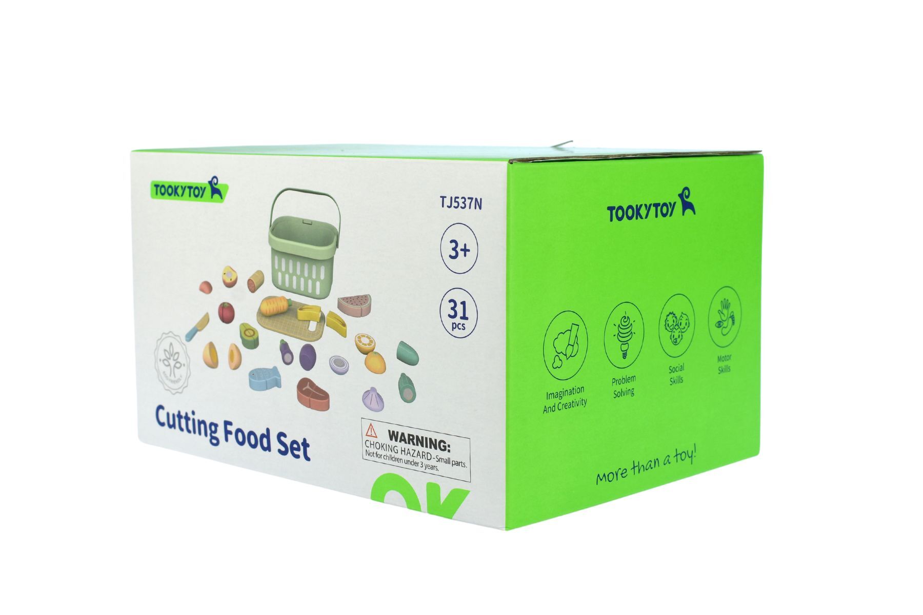 Your little one will love exploring the world with the MY FOREST FRIENDS CUTTING FOOD SET. Introducing the My Forest Friends Cutting Food Set from Tooky Toy-a delightful culinary adventure for budding chefs and food enthusiasts alike. This beautifully crafted set features 14 different foods, each meticulously designed for realistic play. Complete with a wooden knife, cutting boards, and a convenient shopping basket for storage, this set provides endless opportunities for imaginative play and skill development. Watch as children practice their cutting skills with the lifelike foods, held together with velcro so they separate realistically when sliced. From eggs to carrots, meats to fish, and a variety of fruits including apples, oranges, and more, the assortment of delicious foods offers a diverse culinary experience. Crafted by Tooky Toy from high-quality timber and featuring a durable plastic carry basket, this set is built to withstand hours of play. The chopping board cleverly doubles as the lid to the basket, ensuring easy storage and organization when playtime is over. With its child-safe, non-toxic paint finish, parents can have peace of mind knowing that safety is a top priority. Encourage creativity, fine motor skills, and imaginative play as children explore the world of food preparation and cooking with the My Forest Friends Cutting Food Set. Embark on a culinary journey filled with fun, learning, and endless possibilities with this delightful playset-a must-have addition to any play kitchen or imaginative play space, brought to you by Tooky Toy.