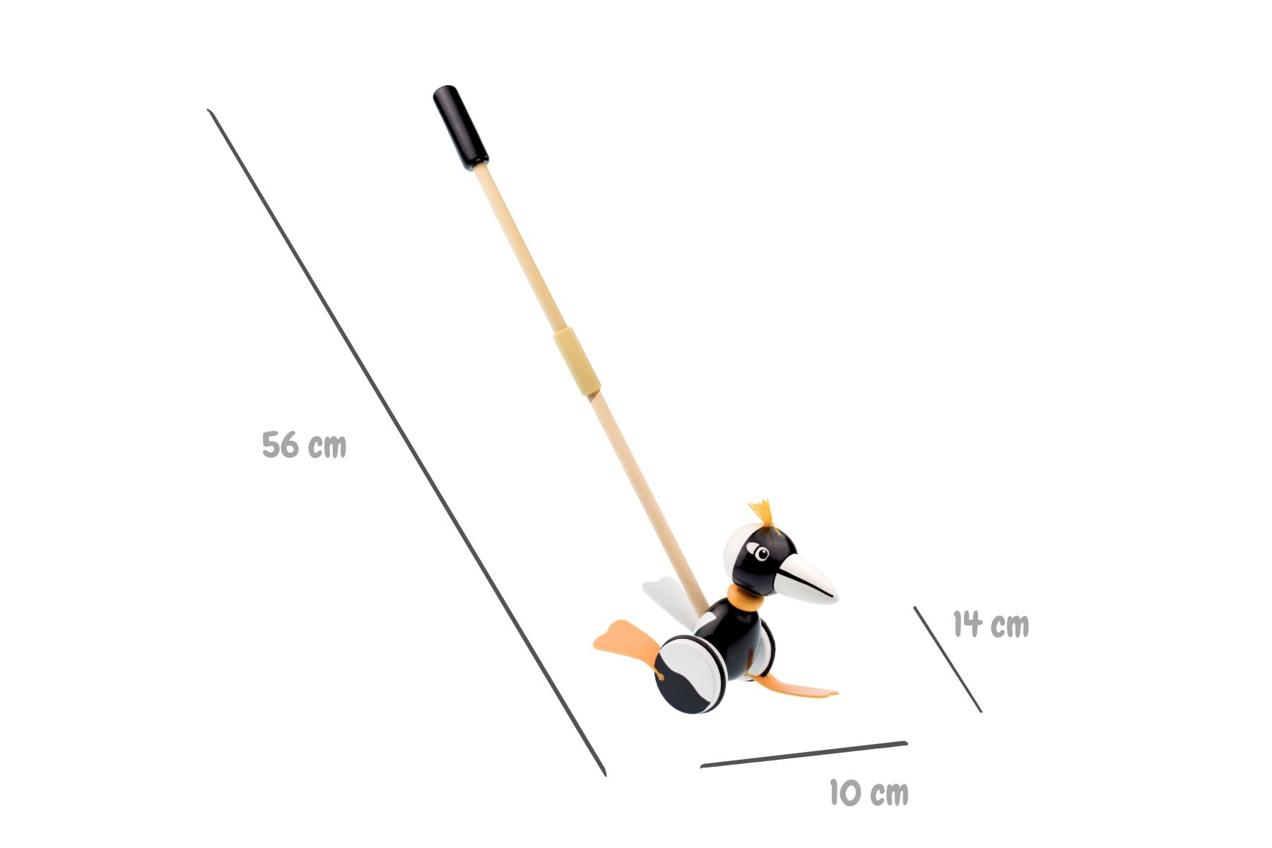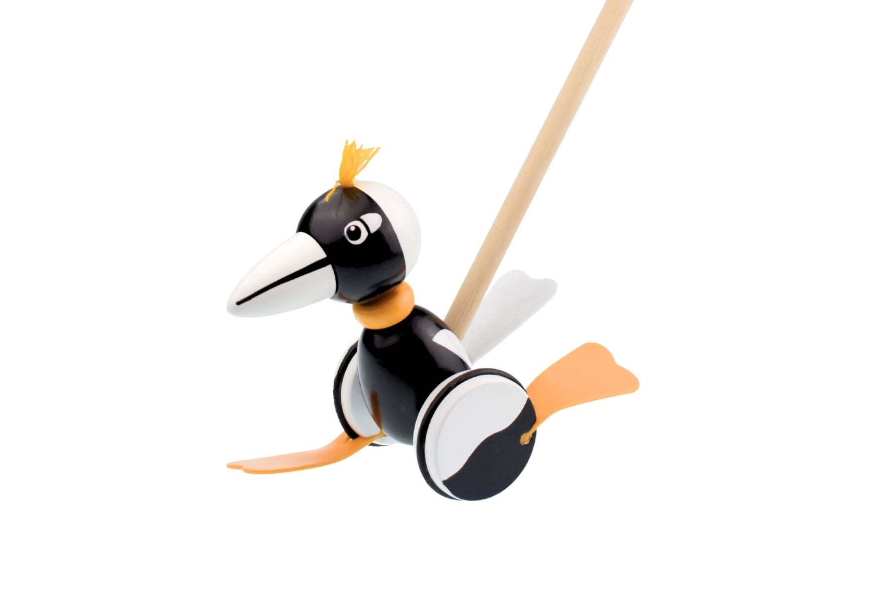 Support your toddler's mobility and balance with the fun-filled PUSH ALONG MAGPIE. Meet the delightful Push Along Magpie from Kaper Kidz—a cheeky little Aussie bird ready to waddle alongside your toddler on their big adventures! Crafted from smooth, sturdy timber and painted in striking black and white with bright orange flappy feet, this charming magpie comes with a handy handle for tiny hands to push and guide. As it strolls across the floor, its playful feet flap merrily, bringing the iconic Australian bird to life right at your child’s fingertips.