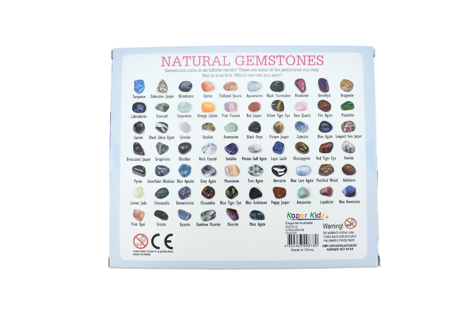 The ULTIMATE GEMSTONE COLLECTION 48PCS is a fantastic addition to any playroom, encouraging hours of open-ended fun. Introducing the Ultimate Gemstone Collection by Kaper Kidz, a treasure trove of exploration and wonder. Unveil the captivating beauty of the earth with this collection box, featuring 48 different tumbled semi-precious gemstones to ignite your curiosity. Marvel at the vibrant colours, unique patterns, and dazzling luster as you hold each gemstone in your hands. With such a diverse assortment, you'll discover an array of treasures waiting to be explored. To enhance your gemstone journey, each stone is accompanied by a picture on the back. Match your gemstones to their corresponding images and names. Expand your knowledge and become a gemstone connoisseur while building your own stunning collection The Ultimate Gemstone Collection by Kaper Kidz offers an educational and awe-inspiring experience for gemstone enthusiasts of all ages. Delve into the wonders of the earth and let the magic of gemstones captivate your imagination.