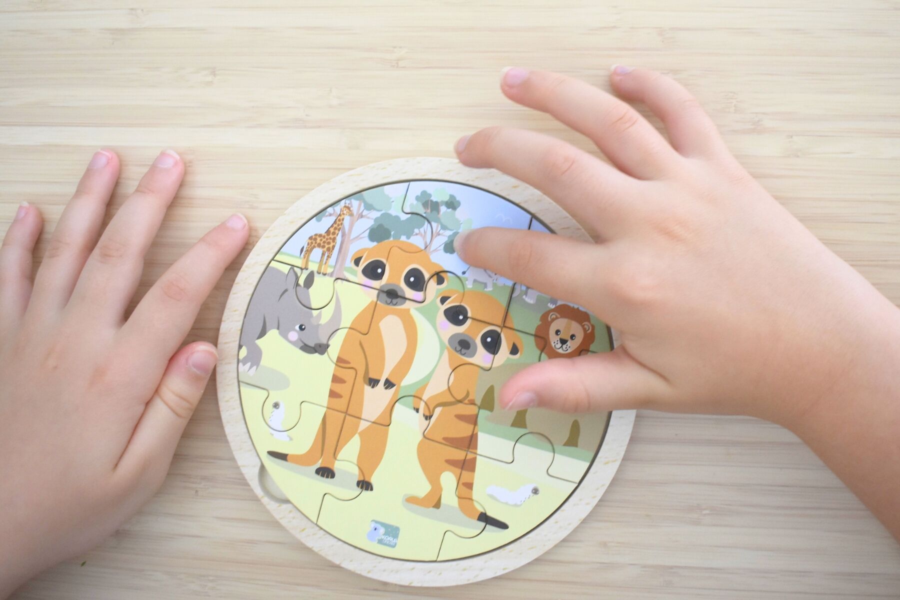 Spark your child's problem-solving skills with the engaging WILD BUDDIES 9PC ROUND JIGSAW PUZZLE MEERKATS. Discover a world of wildlife fun with the Wild Buddies 9 Piece Round Jigsaw Puzzle Meerkats from Koala Dream. Featuring two adorable meerkats front and centre, this charming wooden puzzle invites little learners into a lively savannah scene. Children will enjoy spotting the rhino, lion, giraffe and elephants in the background as they explore colours, animals and storytelling through play.